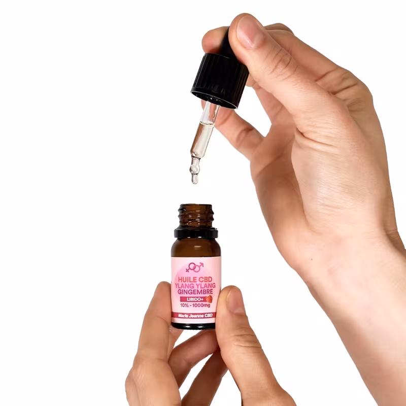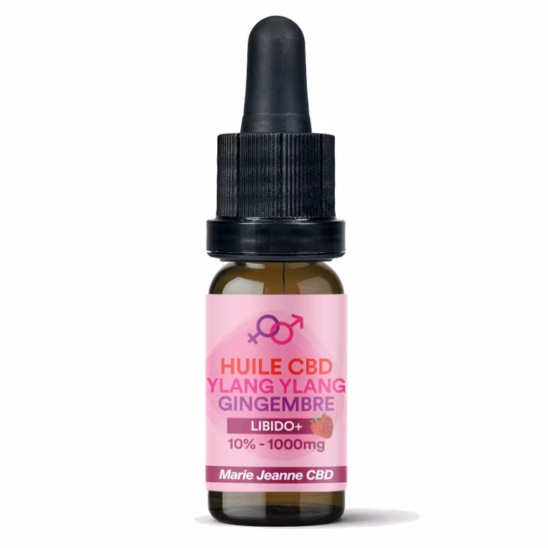 Huile CBD Libido 10% (1000mg) broad spectrum avec gingembre et ylang ylang. Sans THC, arôme fraise, format 10ml pour une utilisation précise.