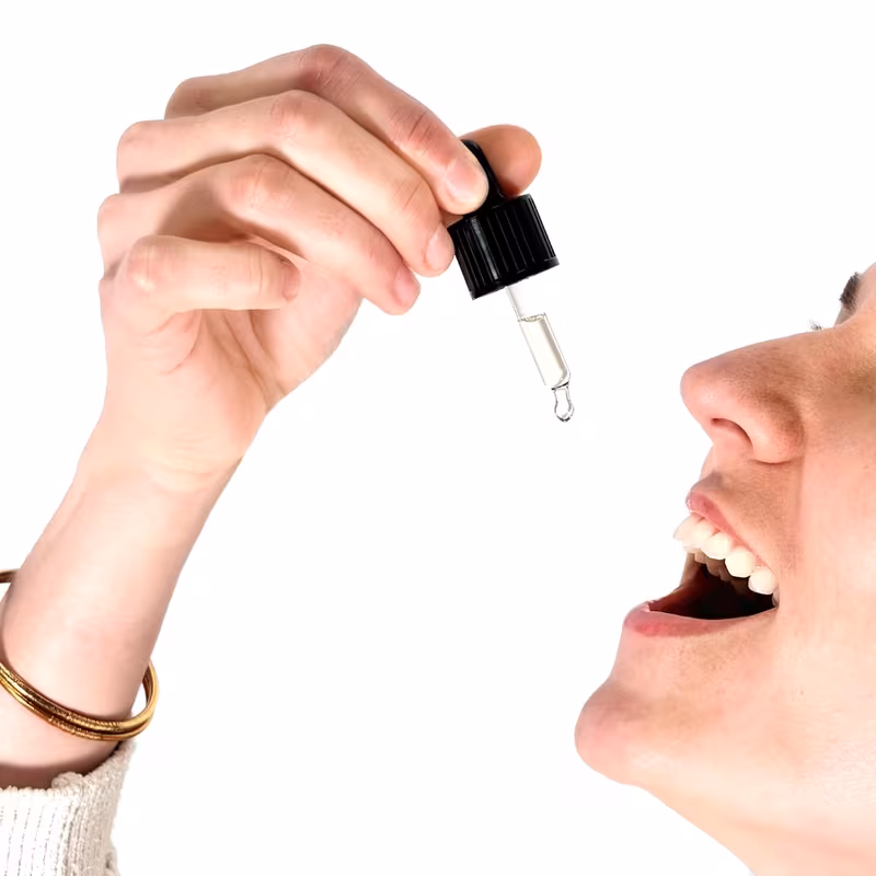 - Sublingual : 1 à 3 gouttes sous la langue, attendre 60 secondes avant d’avaler